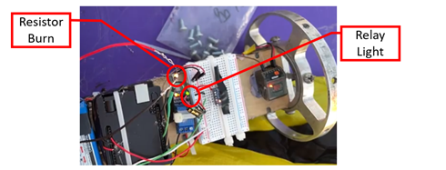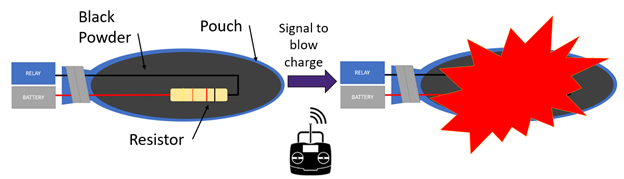 Twenty-two-gauge wire runs from the electronics bay to the leads with a 10 Ω resistor connected. The resistor and top portion of the leads are embedded in a pouch with the loose black powder. The top portion of the leads and pouch are twisted and wrapped tightly using electrical tape. The bottom portion of the leads are connected to a relay, SRD-05VDC-SL-C, which is compatible with the Arduino Uno. It is triggered by the Arduino Uno through the microcontroller setting a pin to high which causes the relay to close enabling 22V to be sent across the resistor see. The ejection charge size was based on the Ideal Gas Law and the parachute manufacturer’s recommended ejection pressure. The nose cone and parachute eject, allowing the parachute to expand and descend the flight vehicle. The parachute and nose cone are connected to the fuselage interior by a Kevlar shock cord and carabiners.