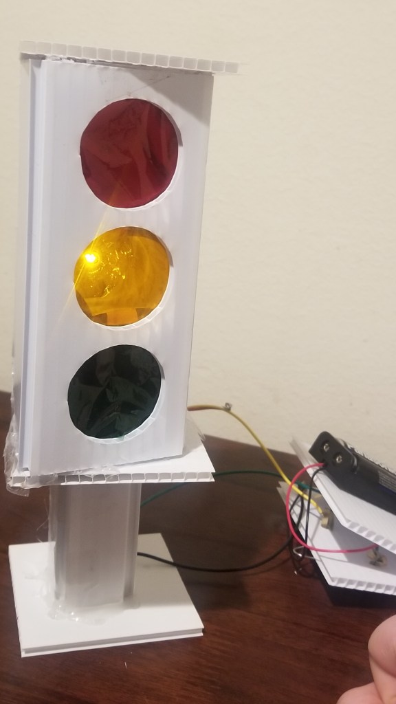 During this coordinated event I taught students through a webcam about electricity. I first started the event by discussing the founder of the traffic light, William Potts. Then eventually with the kits STEM NOLA sent the students I walked them through the steps to build a traffic light. To the left is the traffic light completed